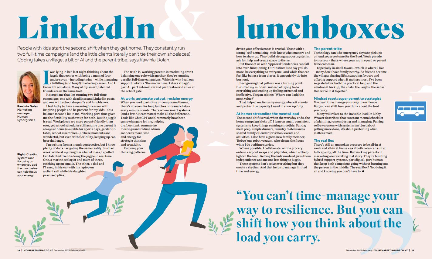 In this article courtesy of NZ Marketing Magazine, Marketing Manager, Rawinia Dolan says coping takes a village, a bit of AI and the parent tribe! People with kids start the second shift when they get home. They constantly run two full-time campaigns (and the little clients literally can’t tie their own shoelaces).